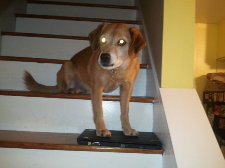 Then, when I decided to sit down to write about Latke’s adventure, he decided that was offensive and tried to prevent me from blogging. He literally stepped on my computer and looked at me with evil eyes. He’s a very dangerous beast. I had to sneak into the other room and use the other computer to do this… Wait, what’s that noise I hear? Who is that coming down the hall? Oh no……….