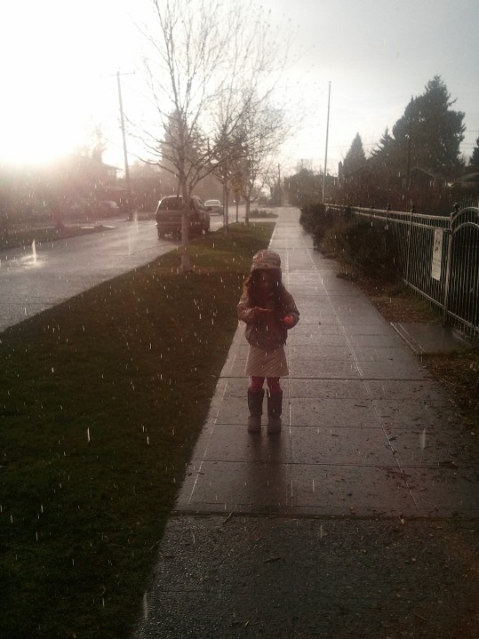 We went out around the corner and the light was really wonderful – the late afternoon sun was lighting up the light rain. Then the rain got thicker and heavier – wetter, really. Then my daughter noticed it was hail. Suddenly the hail came streaming down in wet streaks. Very wet – we were getting soaked. I took my phone out, turned around and took a bunch of photos as she walked toward me trying to catch the hail. The sun was behind her and made for a perfect photo opp. I’m just glad my phone’s camera was up to the task. Here are two of the best photos. I love that you can actually see the hail being lit up by the sunlight.