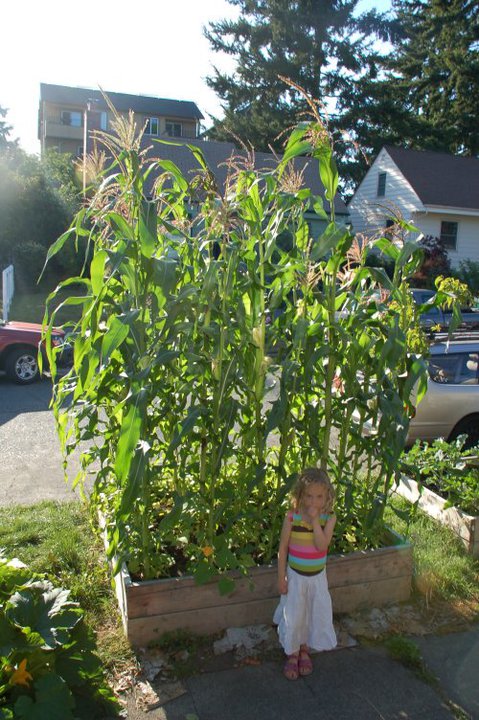 My daughter Lola stands in front of the corn that I grew in my front yard in Seattle a few years back. The corn grew tall but ran out of time (cold wet fall comes too soon here) to fully mature.